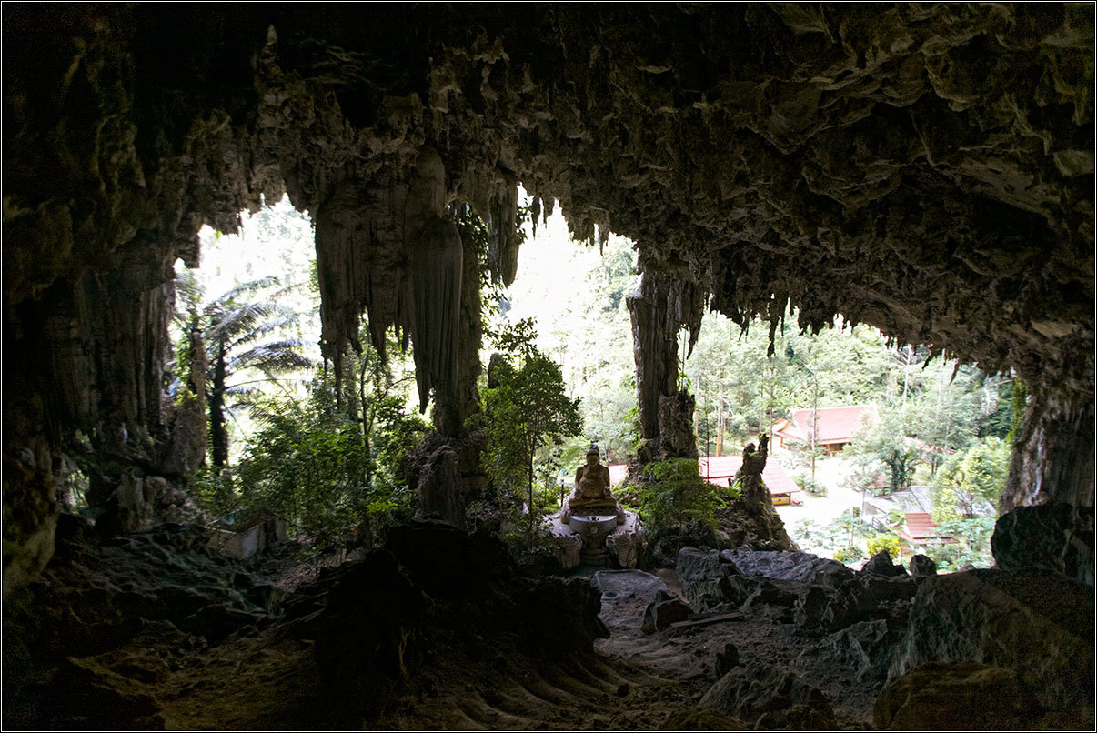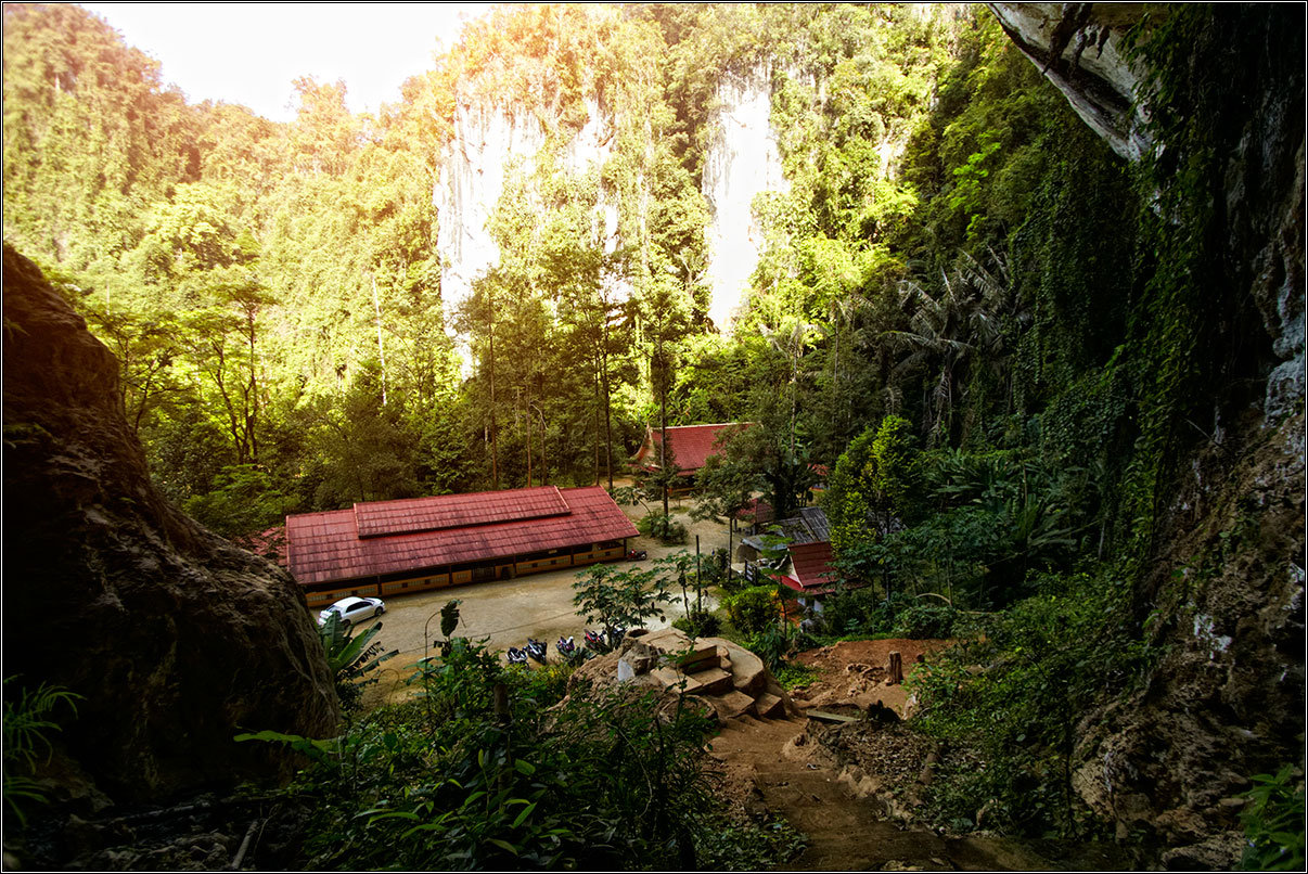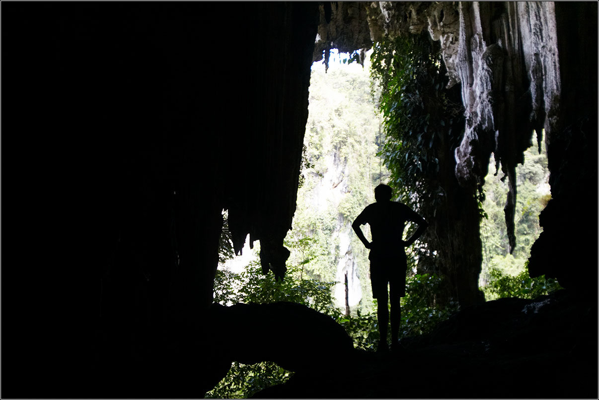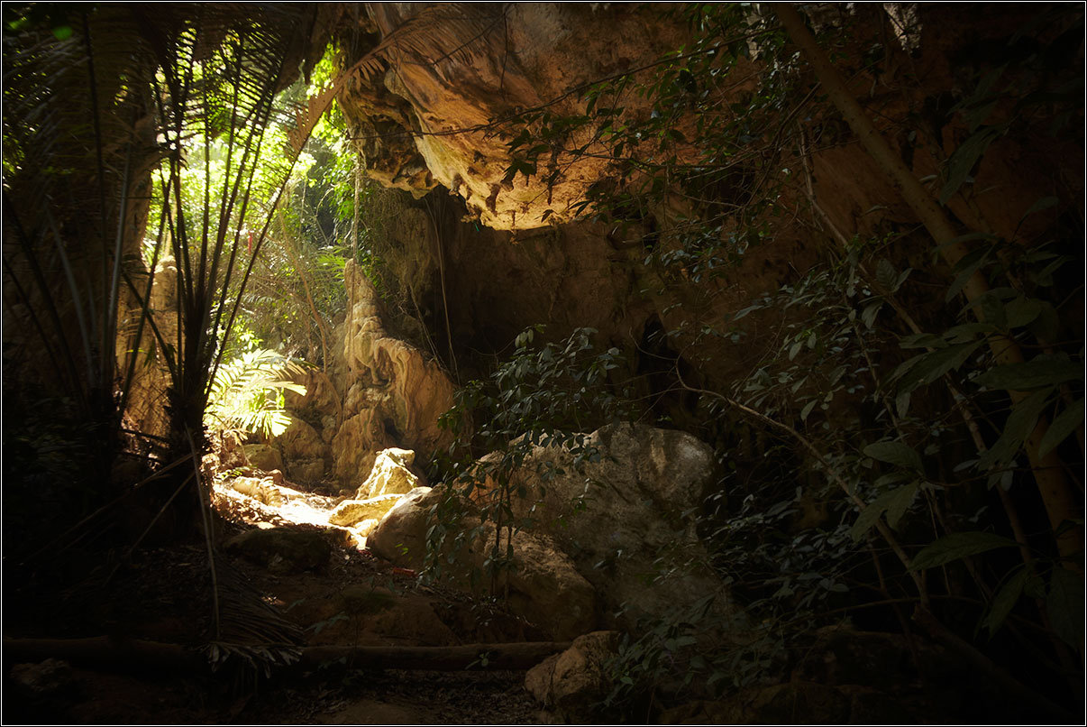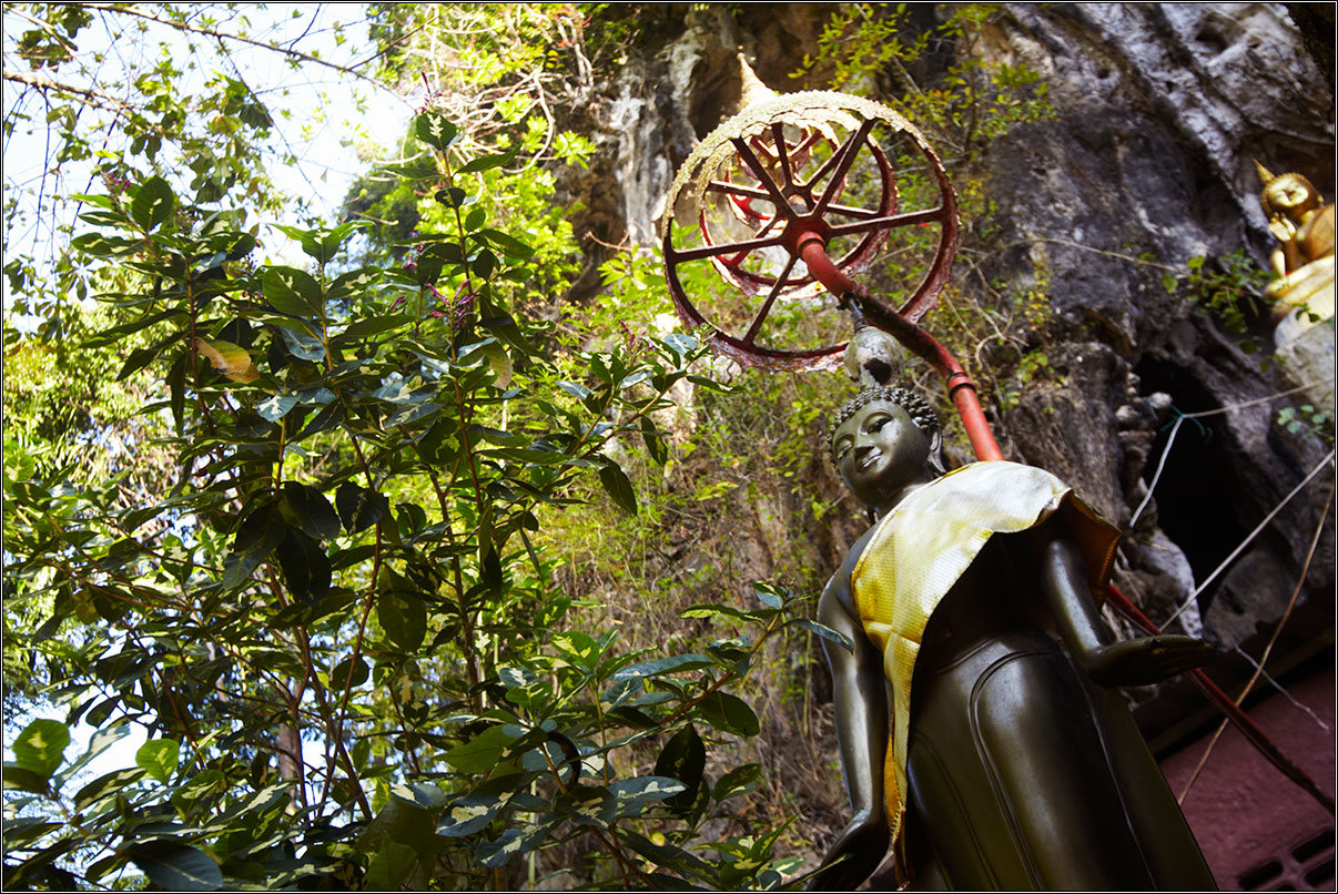11.02.18Все окрестные горы и скалы изрыты пещерами — местные хрупкие карстовые породы этому способствуют. Их размывает вода, выдувает ветер, в итоге в них постоянно что-то меняется. Горы изрыты дырками, как кусок сыра, сквозные отверстия в скалах выводят на вьюпойнты, откуда открываются симпатичные виды на джунгли, в пещерах гнездятся летучие мыши, каменные будды и монахи. Куда бы ты не забрался — там обязательно будет лежать чья-то подстилка, валяться мятый жестяной чайник, стоять оплывшая свечка, а то и болтаться лампочка на неизвестно откуда тянущемся проводе.