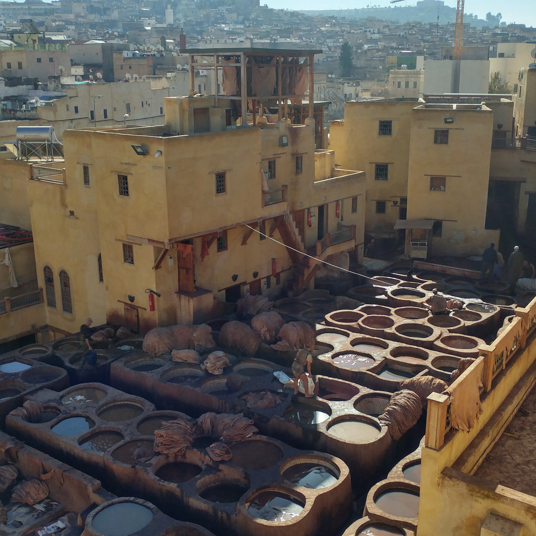 Кожу, снятую с животных, тут же на месте выделывают по древним рецептам вручную с использованием голубиного помёта люди по пояс в едкой щелочной жиже. Работа очень вредная и тяжёлая — после наблюдения за кожевенниками язык не повернется назвать свою офисную работу плохой.