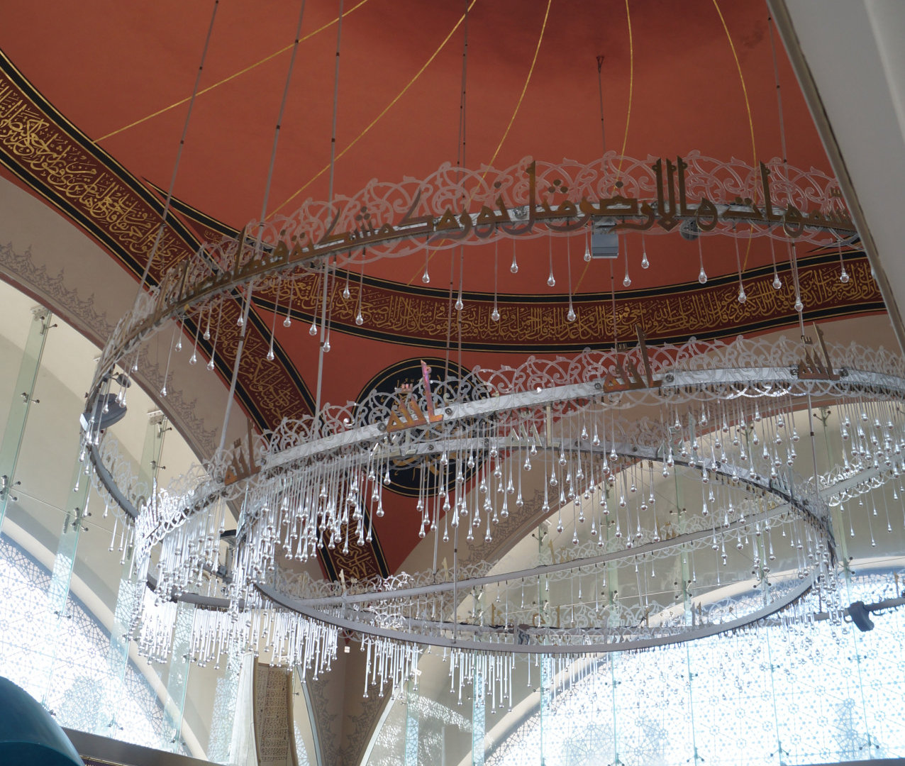 В чем уникальность этой мечети? ЕЕ оформила женщина-архитектор и дизайнер Зейнеп Фадиллиоглу, она построена в авангардном для мечетей стиле и в отдельных элементах напоминает космический корабль, ее стены из стекла, а купол и внутренний фонтан из металла. У мечети 2 минарета высотой 35 м. Внутри люстра сделана из зеркал вырезанных в виде 100 имен Аллаха.