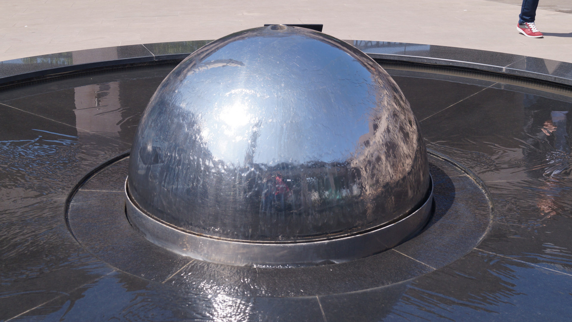 Внутри много света и воздуха, создается ощущение открытого пространства. Во внутреннем дворике всех мечетей есть фонтан, здесь он в виде металлического шара и в нем отражается мечеть и небо и солнце.