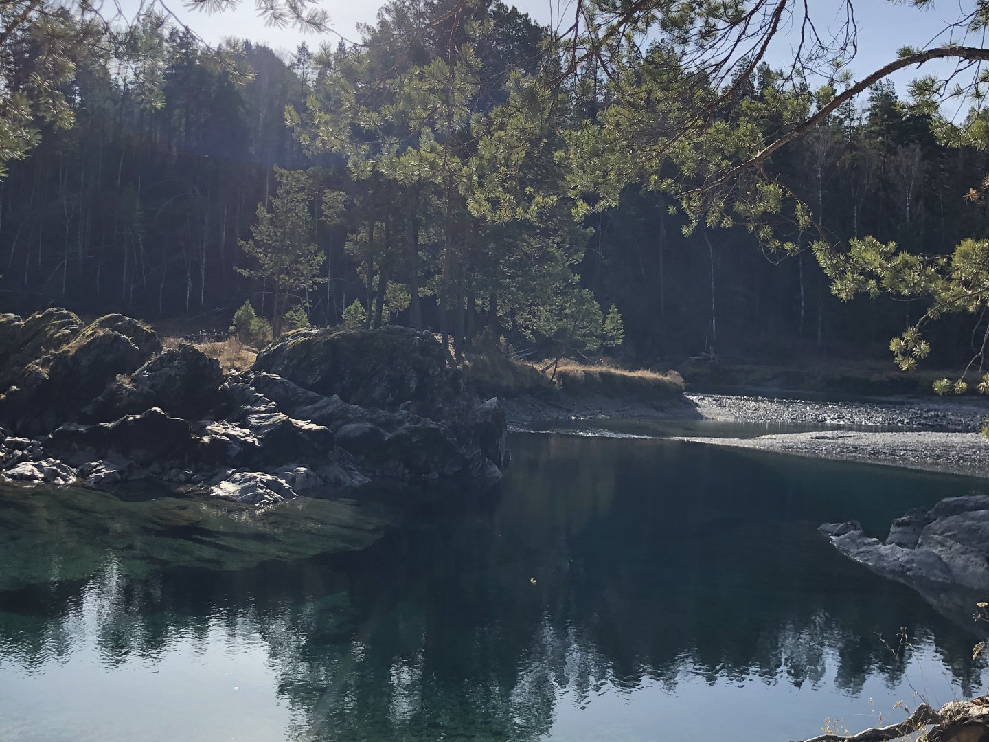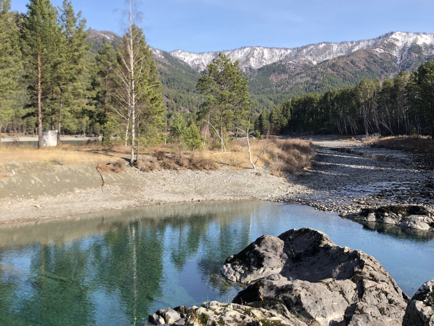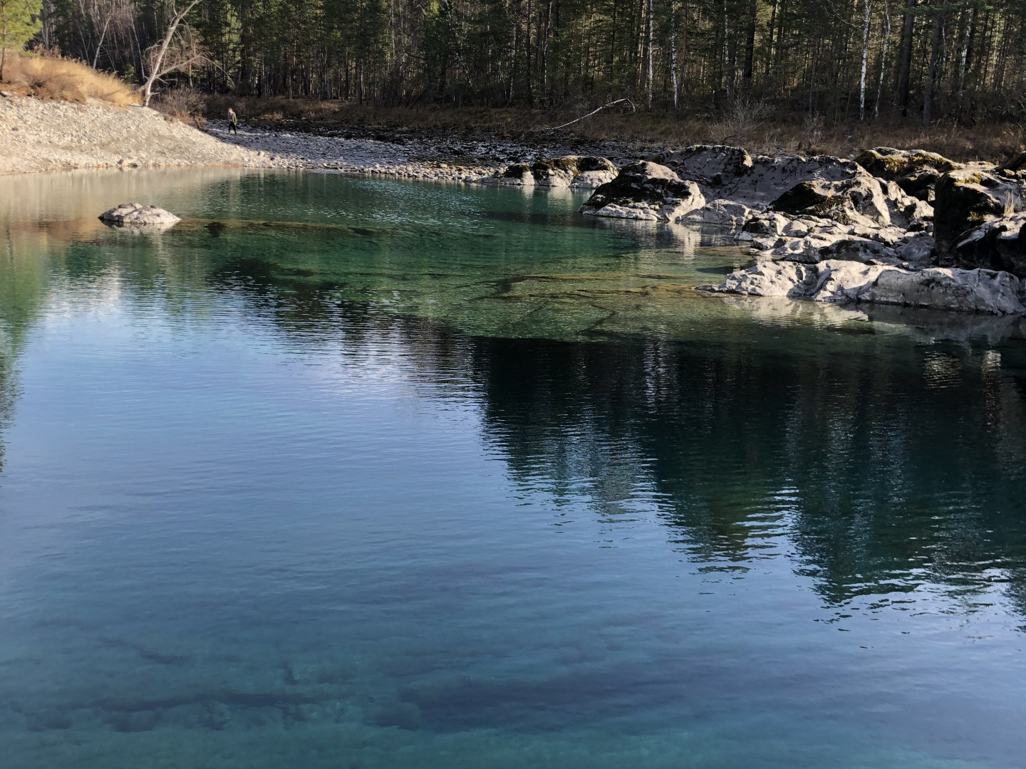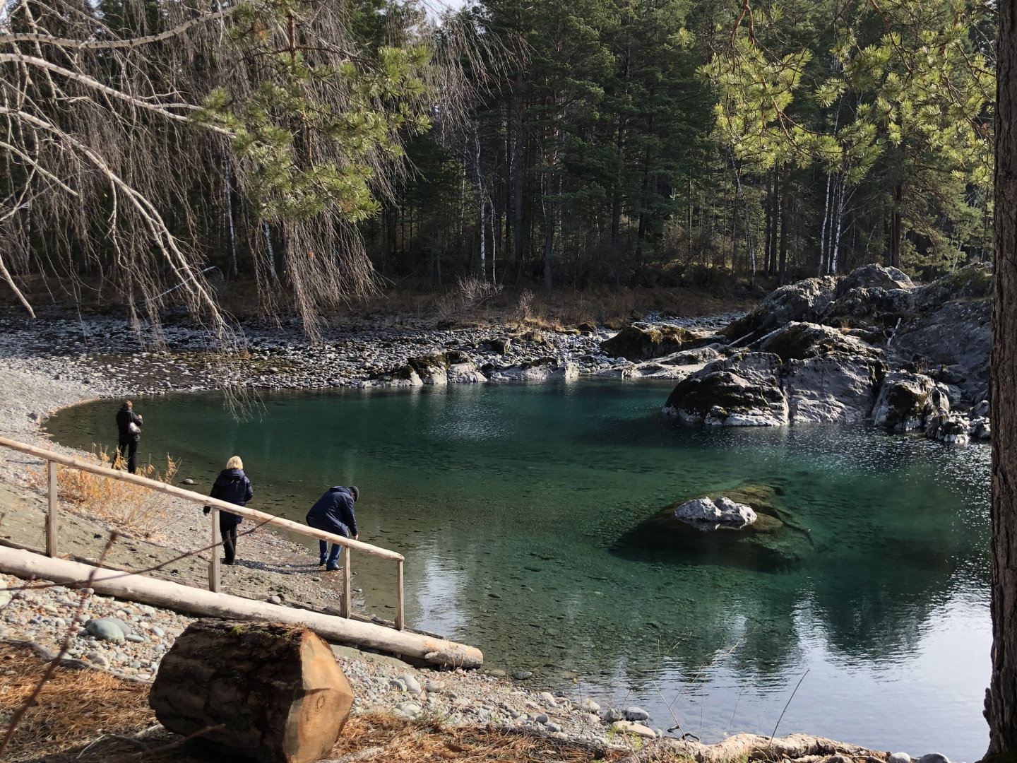 Пройдя до острова посреди реки, мы увидели остатки катунской воды невероятно бирюзового цвета! С одного ракурса темно-зелёные, с другого — голубые, подобно глазам-хамелеонам они манили в свои объятия. И желающих окунуться в них с головой, надо сказать, было немало: купание в тёплых голубыхозерах практикуют тут давно. Установлена даже банька — отдыхай, гость!