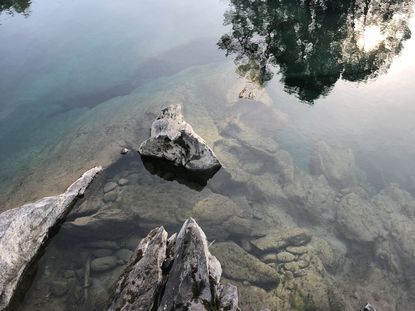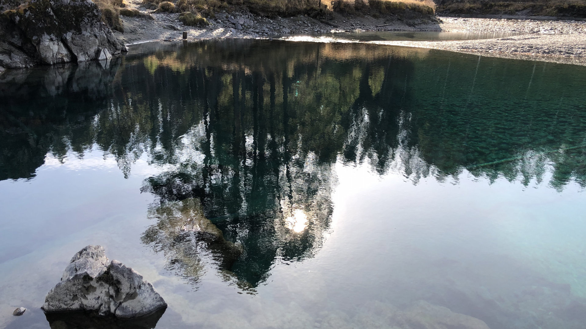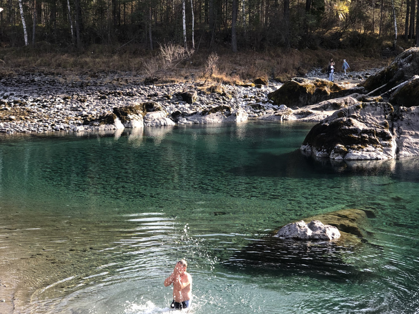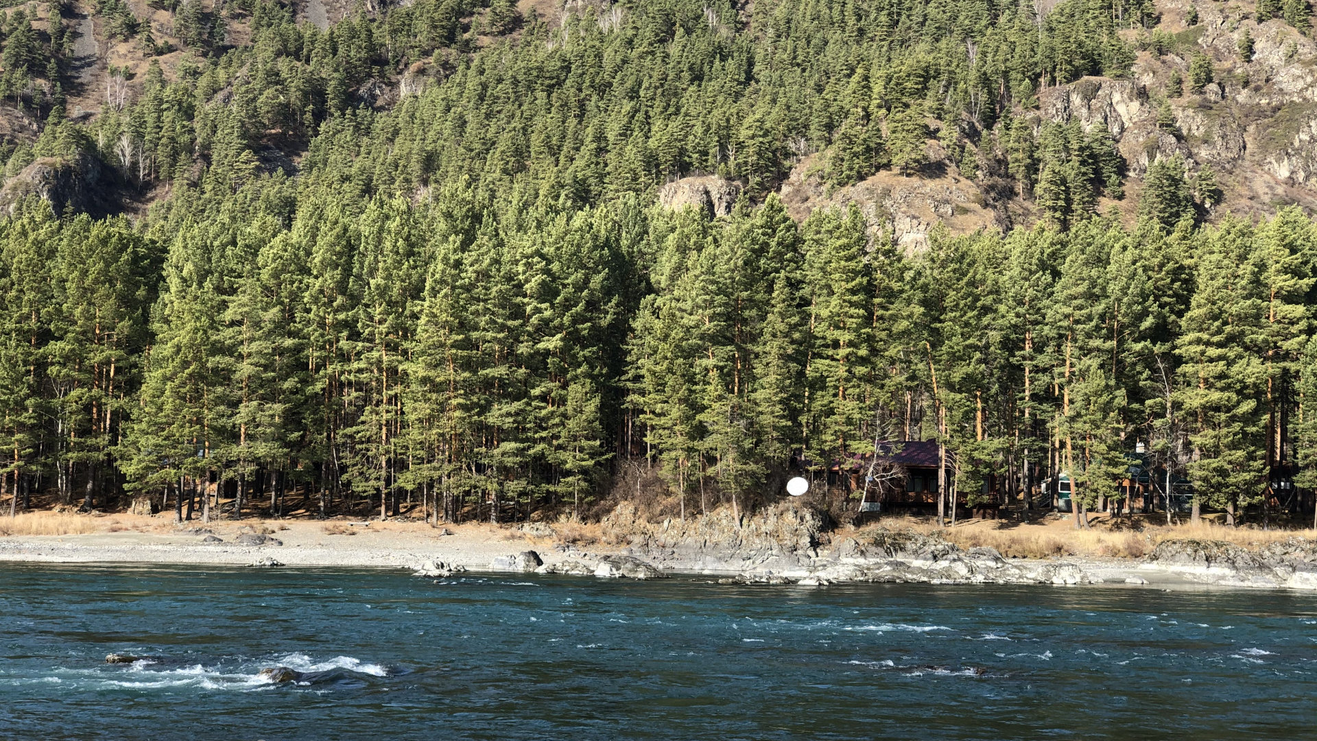 Пройдя до острова посреди реки, мы увидели остатки катунской воды невероятно бирюзового цвета! С одного ракурса темно-зелёные, с другого — голубые, подобно глазам-хамелеонам они манили в свои объятия. И желающих окунуться в них с головой, надо сказать, было немало: купание в тёплых голубыхозерах практикуют тут давно. Установлена даже банька — отдыхай, гость!