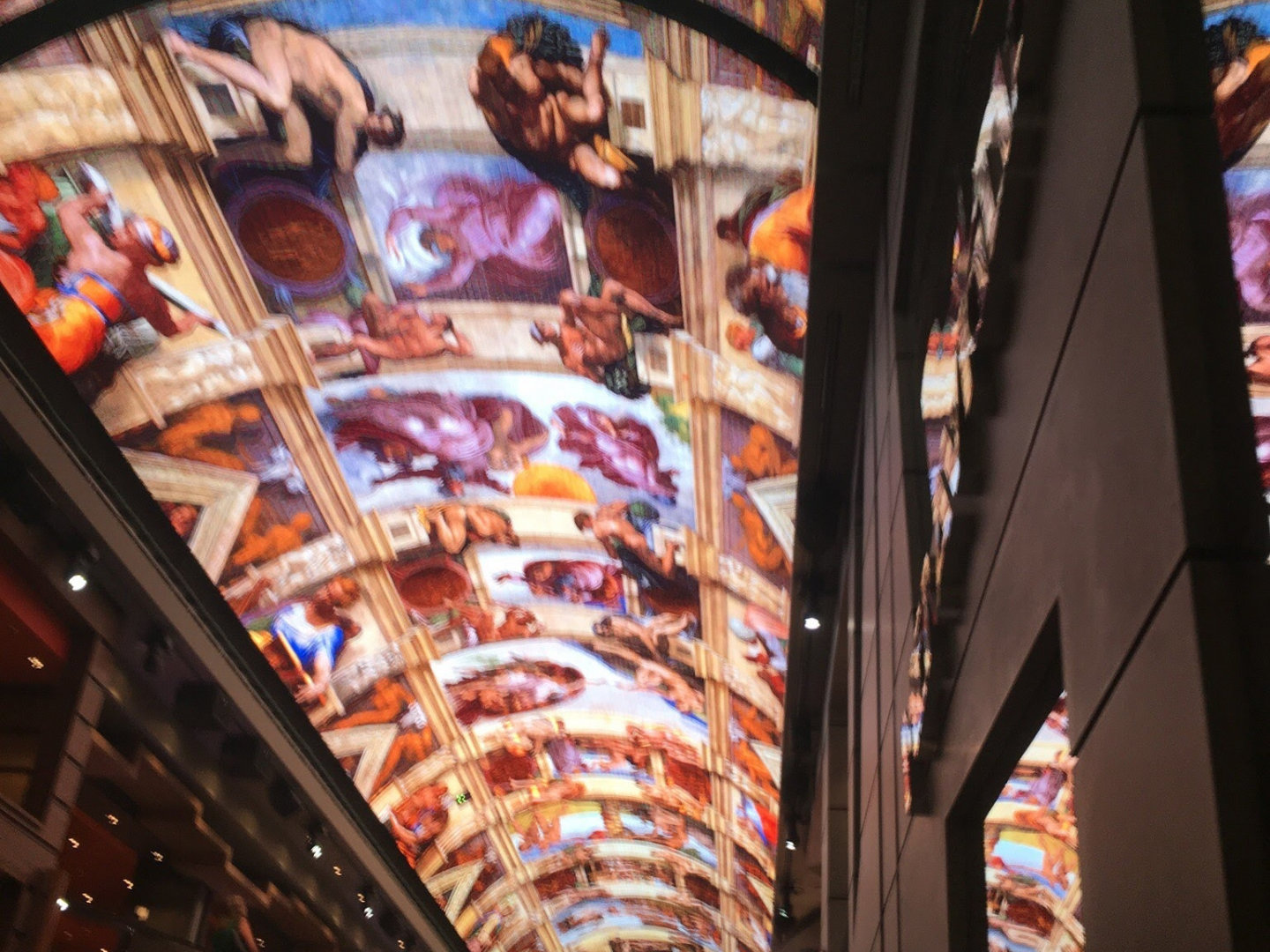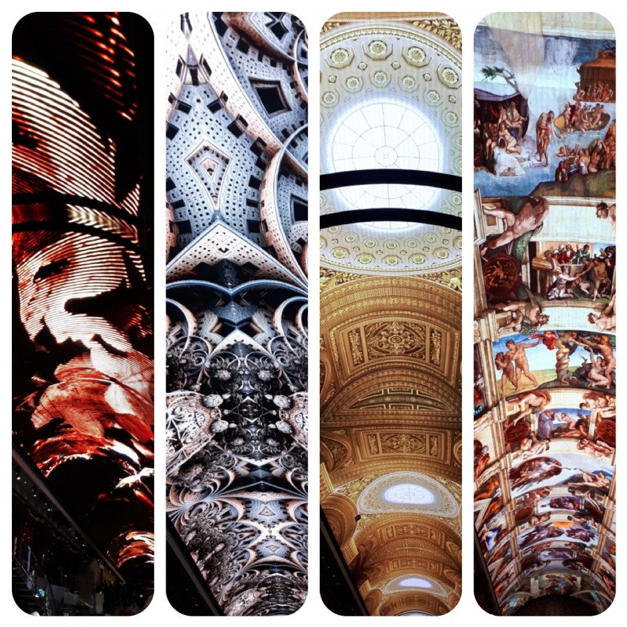 Миравильи так как это- огромный экран. На нет транслируется всякое прекрасное: от видов потолков различных знаменитых сооружений типа Сикстинской капеллы или Парижской Оперы, до музыкальных шоу (несколько раз в день по 15 минут) с фильмами про салюты различных стран или просто красивой анимацией. Поэтому каждый раз, попадая на шестую палубу, ты задираешь голову вверх и чаше всего начинаешь фотографировать красоту.