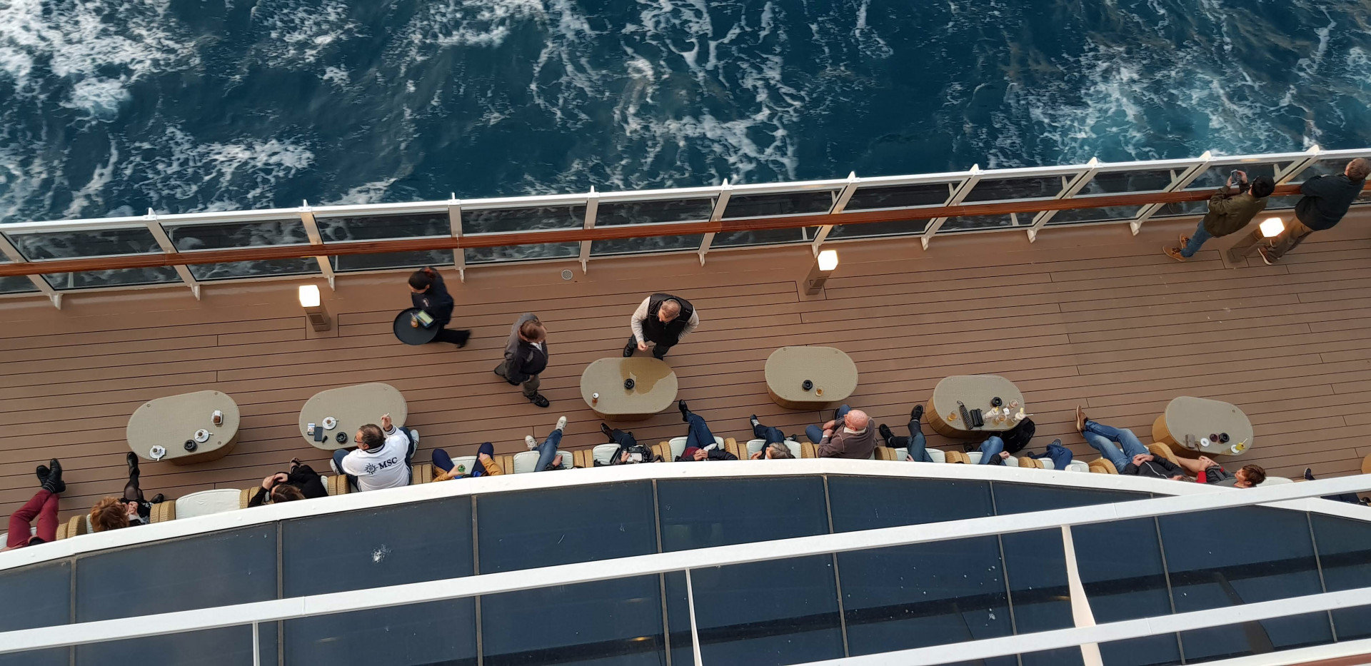 Вечером, когда включают дополнительное освещение и кораблик мягко покачивает, все это заливается совершенно волшебным радужным перепевом, в котором очень хорошо позировать в вечерних нарядах с бокалом шампанского. Все, в общем то этим и занимаются, поэтому вечером в этой зоне основная тусовка.