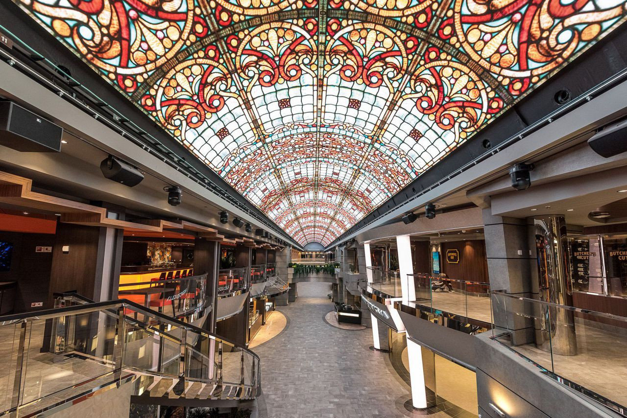 Больше всего променад похож на улицу. Ибо вверх он идет на несколько палуб, по бокам стоят деревья в кадках и открыты магазинчики и бары. Над променадом арочный потолок, который на самом деле является второй «фишкой» .