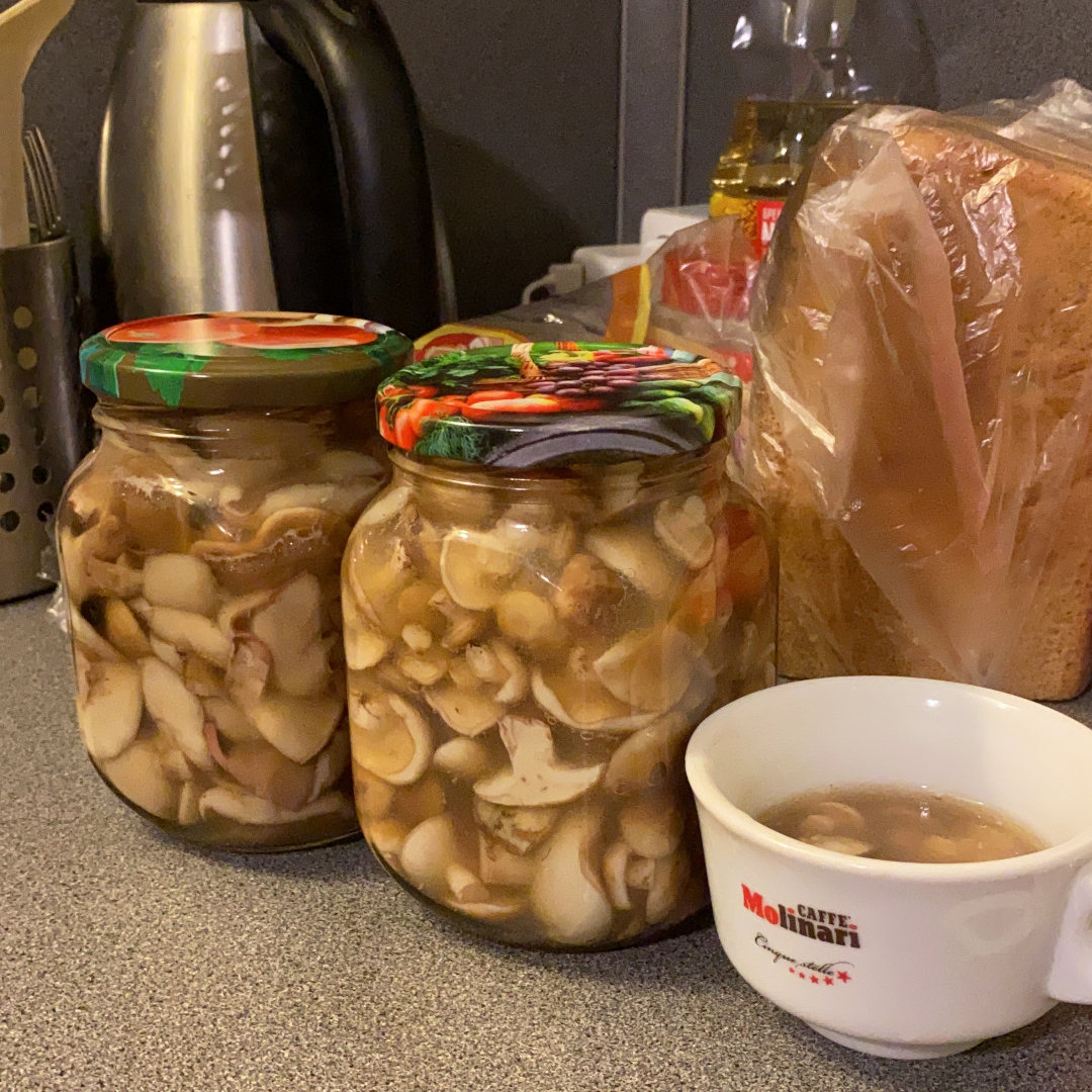 Пришлось мужу метнуться в местное сельпо, купить банки, уксус, два вида перца и вуаля- у нас теперь есть пять банок маринованных маслят и пять пакетов замороженных подберезовиков с опятами. Ну что еще людям делать на отдыхе? Конечно же мариновать грибы. И да, это было прекрасно.
