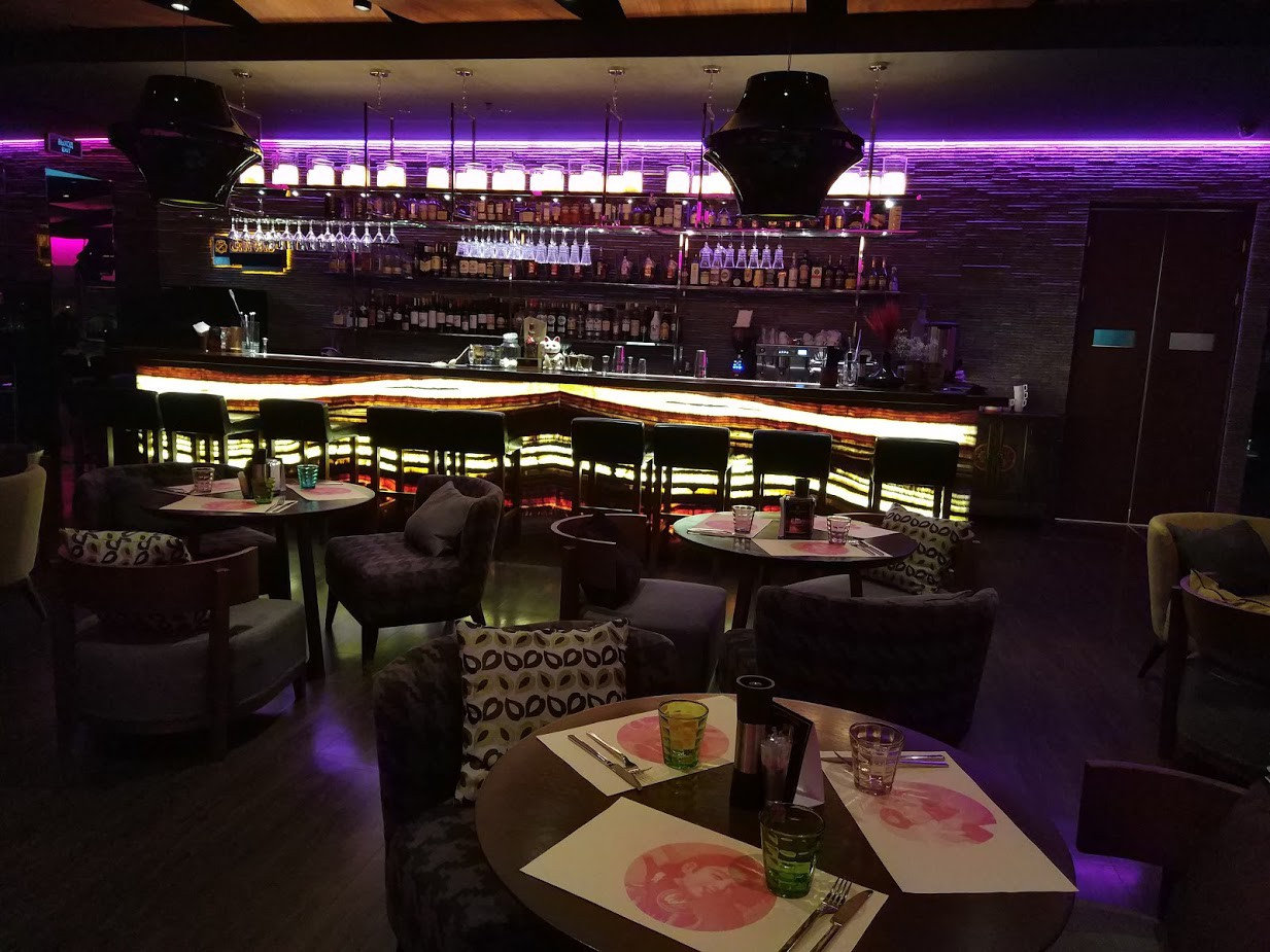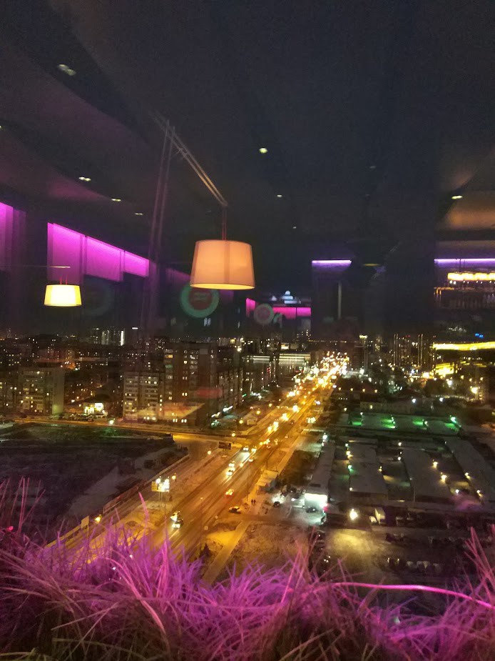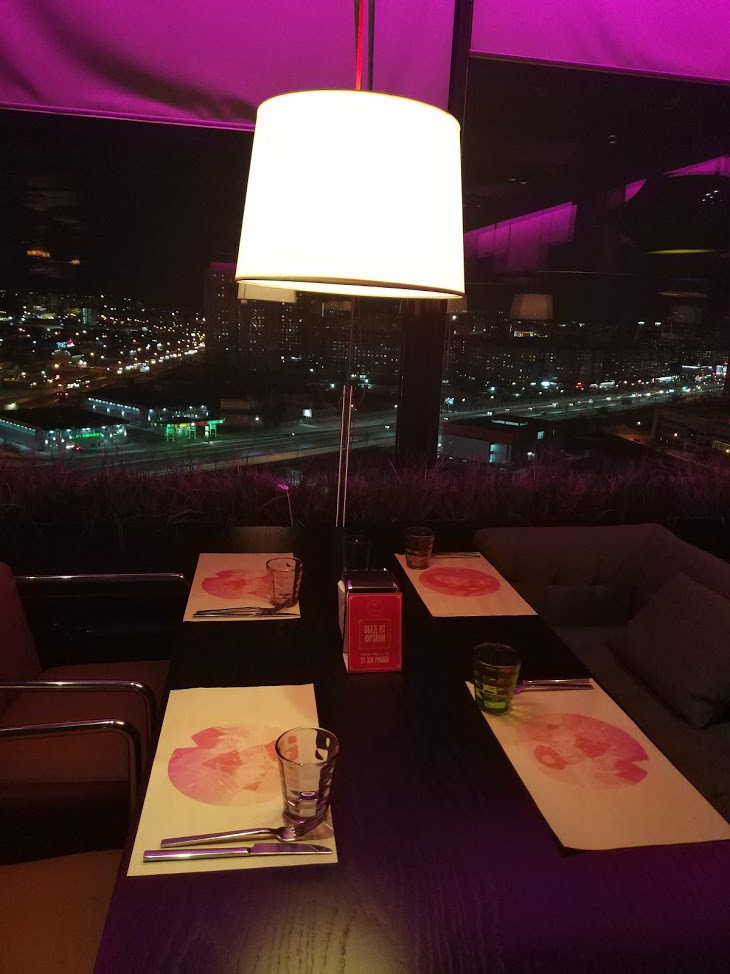 Просторный зал, прохладно. Инересные интерьеры, смешение стилей. Есть большие столы для многолюдных компаний, а есть и совсем крошечные столики. Но самое главное здесь - панорамные виды из окон. Кажется, можно смотреть часами на город, мерцание огней и реки дорог. Искать ориентиры и удивляться, что сверху - всё как-будто не на своём месте...