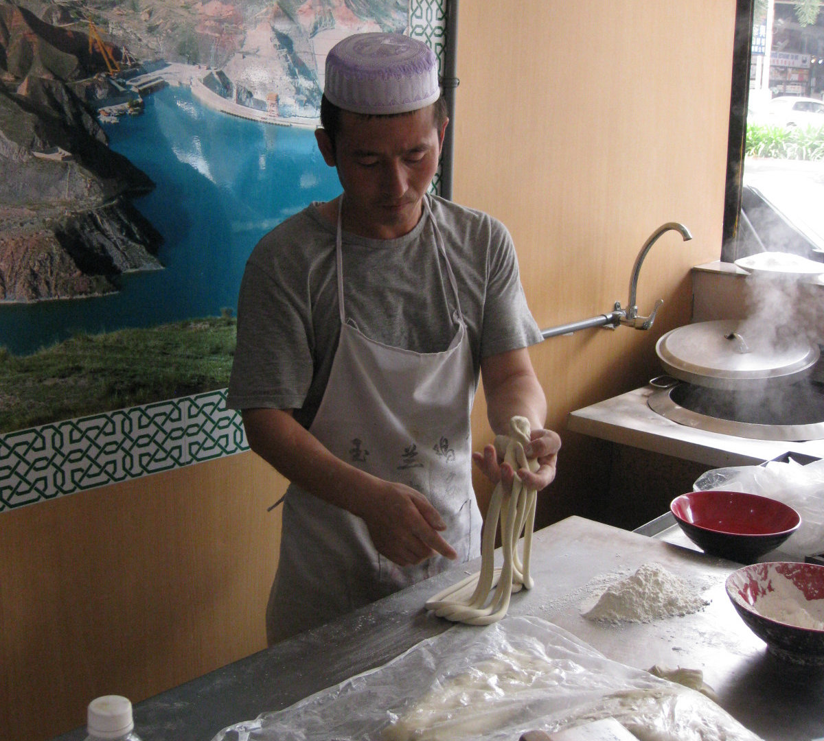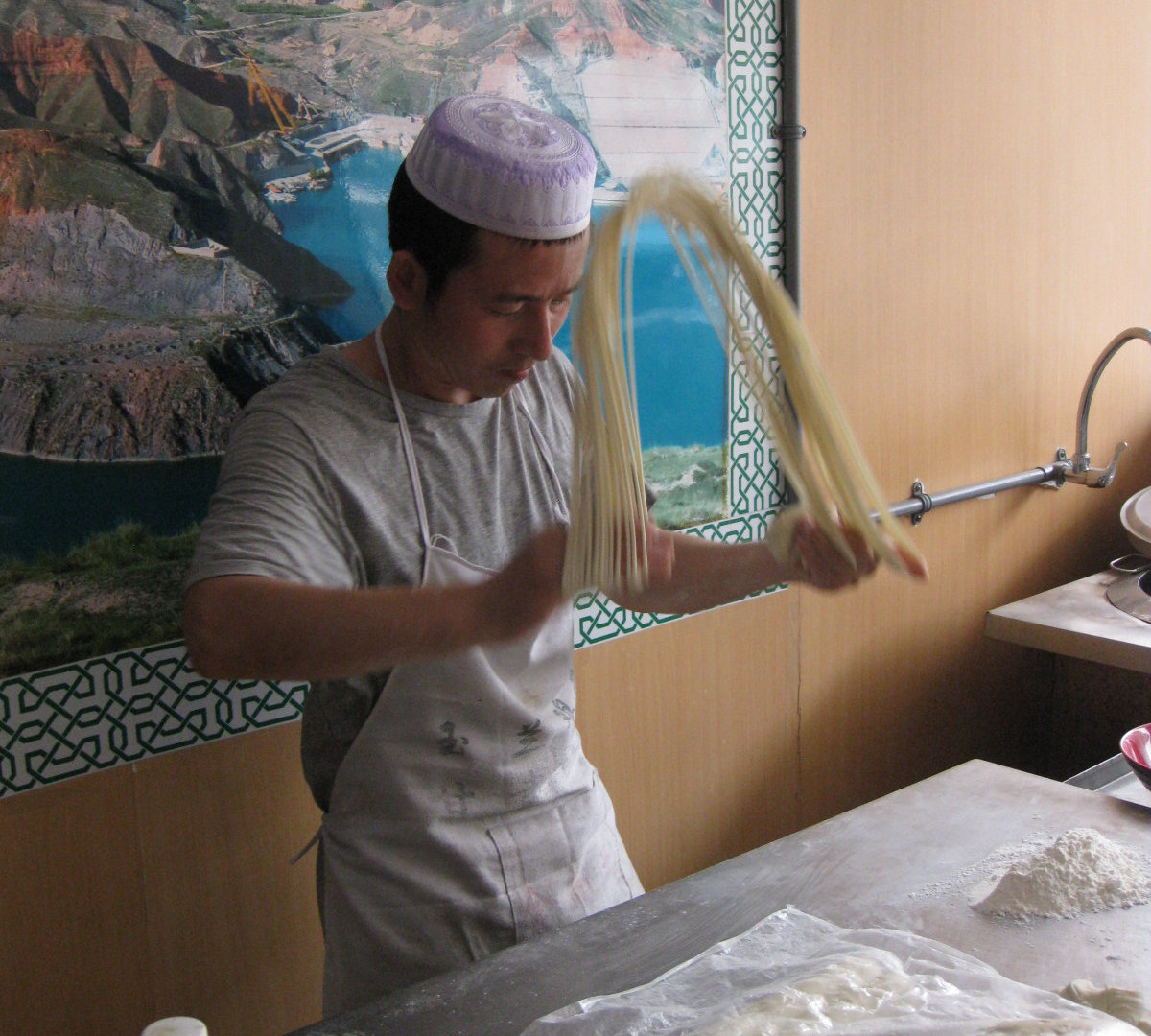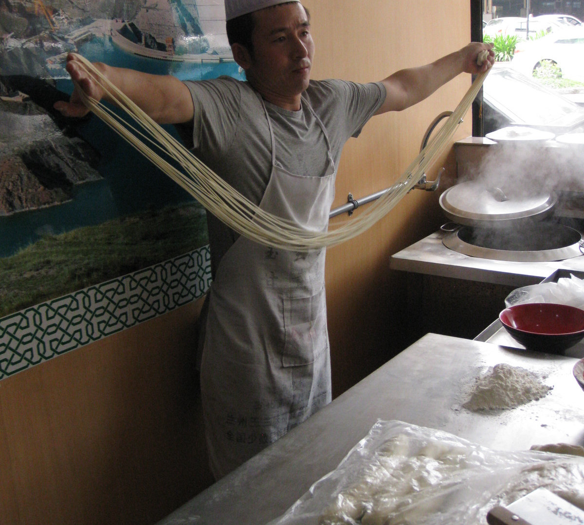 Само приготовление такой лапши-очень необычное действо! Я смотрела,как повар ловко раскатывает и растягивает тесто.А потом вдруг-раз!-и вытянутое тесто распадается на лапшу!